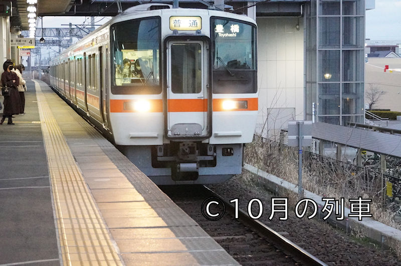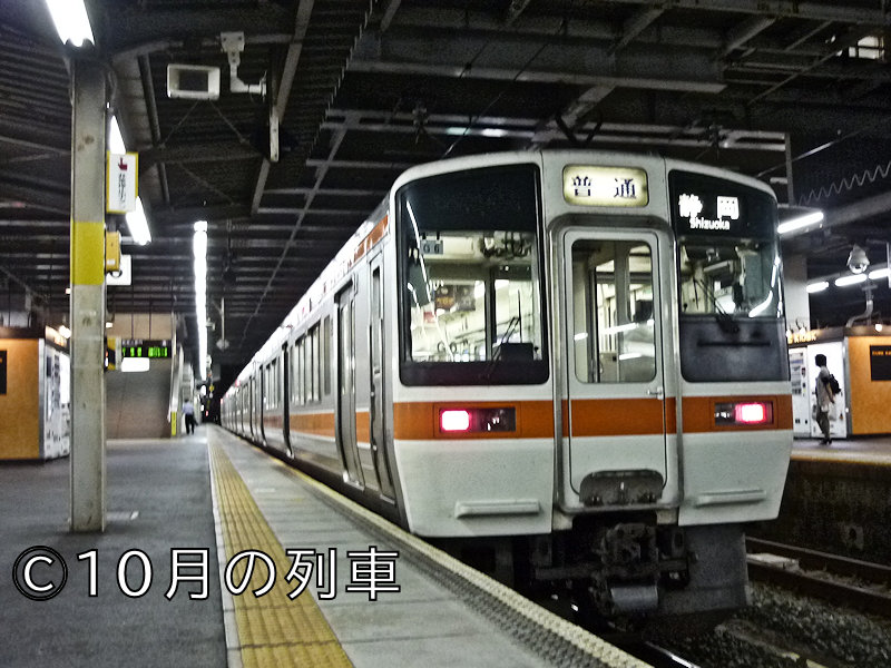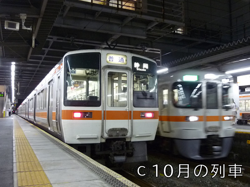豊橋駅6番線を21時30分に発車する、普通静岡行きが311系でした。左の方にちらっと、ワンマン対応となった119系(5300番台?)も写り込んでいますね。