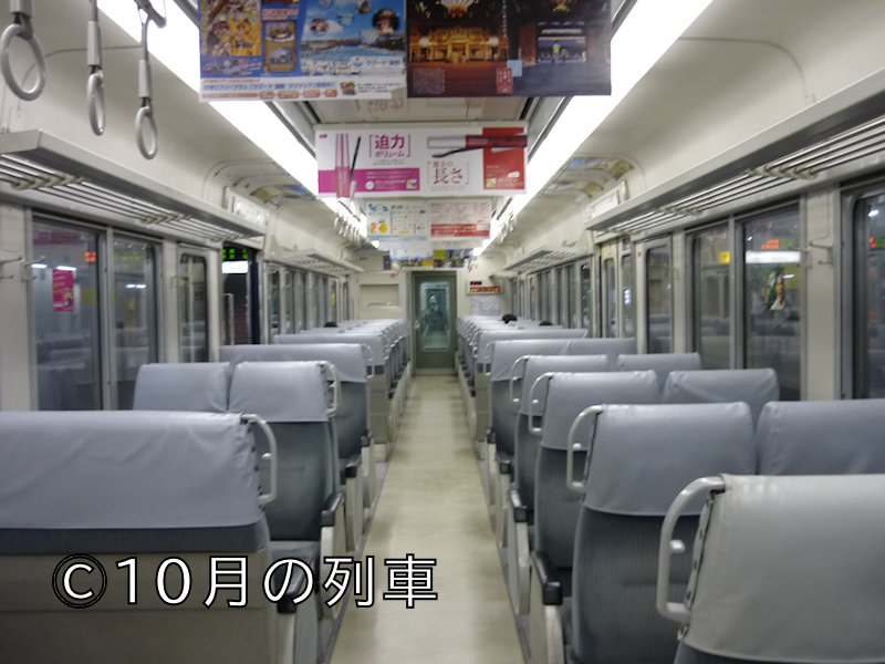 発車前で車内もガラガラだったので、転換クロスシートがずらり並ぶ1枚を。313系や315系の青色のシートもさわやかな印象でいいですが、登場当時このグレーのインテリアはさぞ高級感が漂っていたことでしょうね。