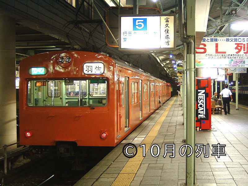 夜の熊谷駅に、羽生行きとして停車中のオレンジバーミリオン塗色になった1011Fです。元々国鉄時代に「モハ90系」として101系が最初に投入されたのは中央快速線であり、オレンジバーミリオンこと朱色1号は国鉄101系にとってはじまりの色です。1957年(昭和32年)当時、暗いぶどう色ばかりだった国鉄電車の中にこの色のモハ90系が登場した時の、人々の驚きはいかほどのものだったでしょうね。