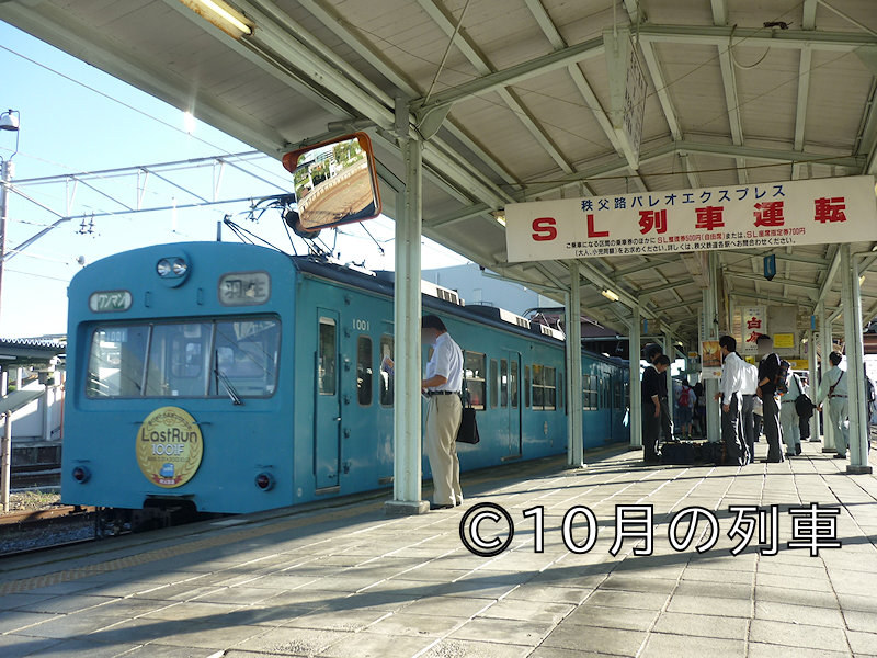 三峰口行きとして上長瀞駅に到着する、スカイブルーこと青22号になった1000系のトップナンバー、1001Fです。人間の目で見ると青緑っぽくもあるこの色ですが、写真に写すとそんなに緑っぽくないという昔から不思議な色ですね。
