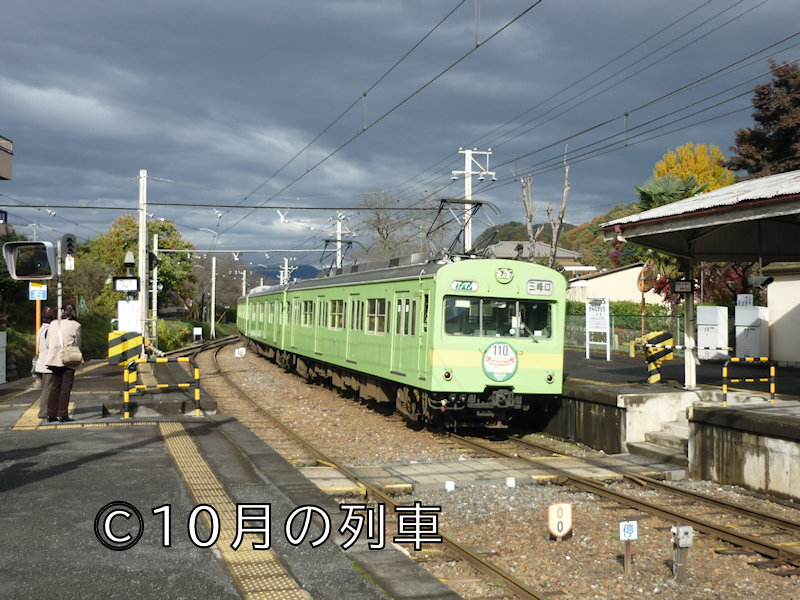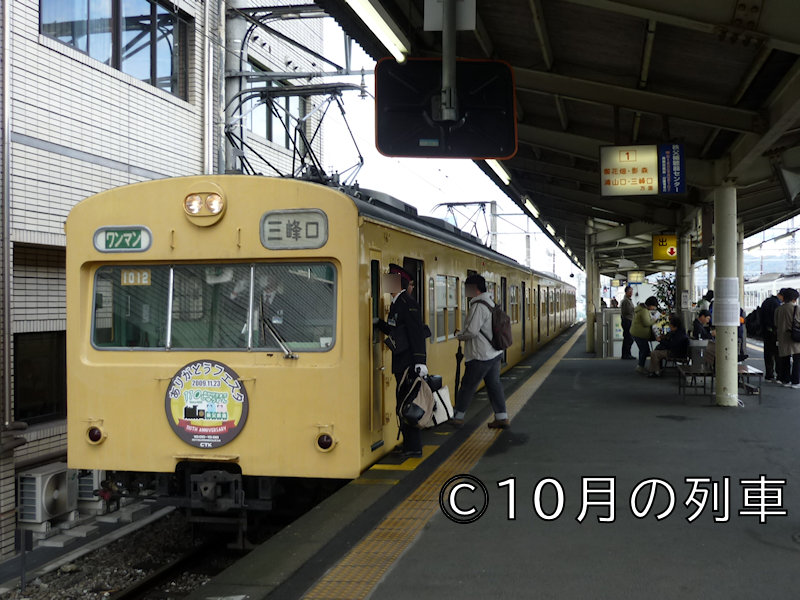 上長瀞駅に到着する、下り三峰口行きの関西線色 1009Fです。101系はウグイス色で山手線を走ったことはありませんが、関西圏では関西本線(現:大和路線)にてウグイス色を纏っていました。ただしそれは前面窓下に黄色5号のライン(警戒色)の入った、首都圏では見られないものでした。のちの車両103系や201系ではこの警戒色は省略されたり、白色になったりと変化がありました。