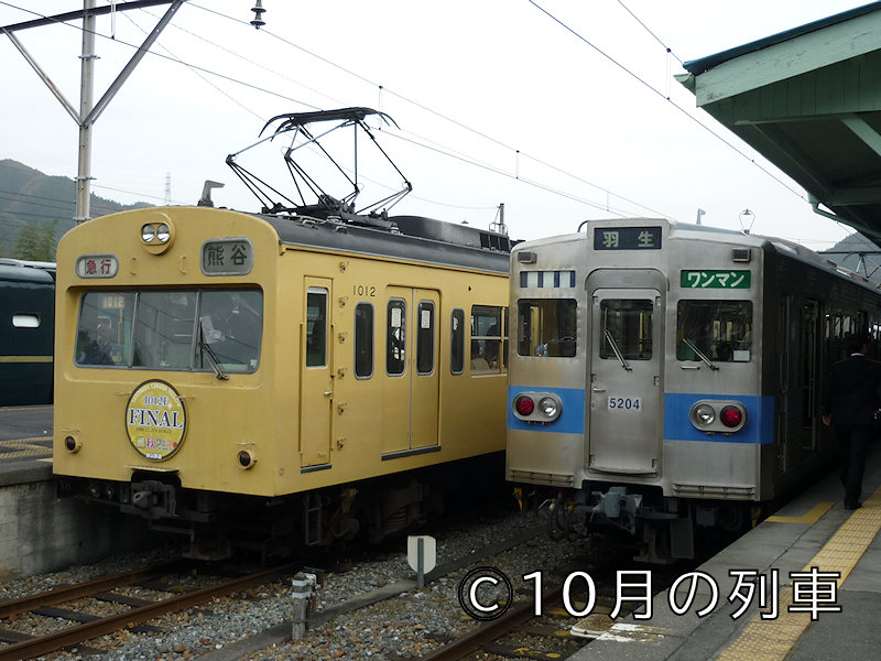 三峰口駅で発車を待つ、イベントの臨時急行列車熊谷行きとして発車を待つカナリアイエローの1012Fです。右に並ぶ5000系の5004Fは、ダンプカーとの踏切事故によって車体が大きく損壊し廃車となってしまったので、今は見られない車両同士の並びとなってしまいました。カナリアイエローの1012Fは2007年11月24日から、2010年12月3日までのおよそ3年間のみ見られました。