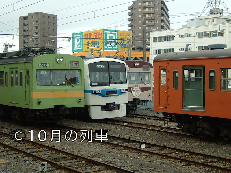 熊谷駅の留置線にて、パンタグラフを降ろし休んでいる関西線色の1009Fです。右にはオレンジバーミリオンの1011F、奥には秩父鉄道100形カラーの1002Fとこれまた豪華メンバーが集まっています。関西線色の1009Fは、2008年4月5日から2011年2月19日までの3年間弱にわたって見られました。
