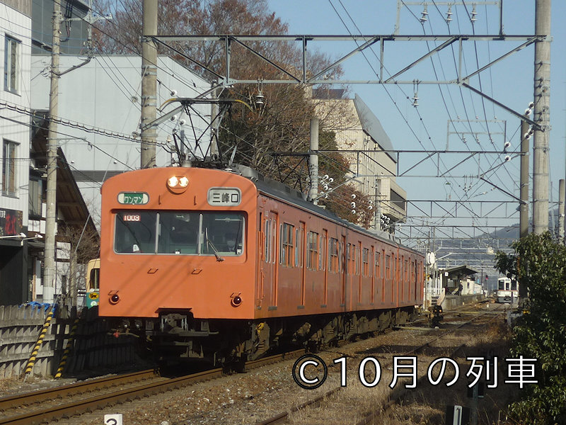 秩父駅を発車して三峰口駅をめざして走る、2代目オレンジバーミリオンの1003Fです。上写真とこの写真を撮影したのはもう1000系自体が消滅寸前の2014年1月3日であり秩父鉄道標準色の1010Fとこの1003Fだけしかもう残っていませんでした。最後の活躍の後、1010Fは同年2月23日に、1003Fは同年3月23日に運行を終了。ここに秩父鉄道1000系の、国鉄101系の長い歴史が終わったのです。中央快速線モハ90系のオレンジバーミリオンから始まった国鉄101系は、57年後、奇しくも同じオレンジバーミリオン塗色の車両をもってこの世を去るということになったのでした。